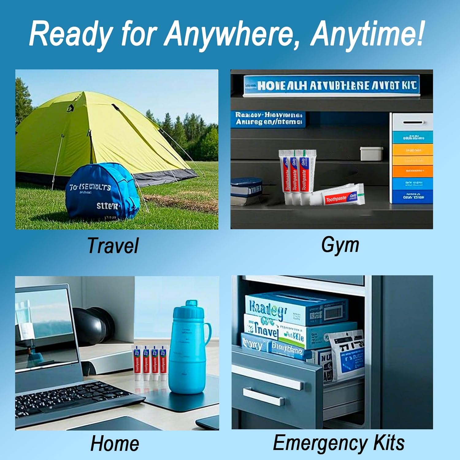 Cada tubo é compacto, medindo apenas 0,8” x 2,5”, o que facilita o transporte. Você pode levá-los nas roupas, carteiras ou bolsas de ginástica sem preocupação. A ponta vedada evita vazamentos, permitindo que você escove os dentes em qualquer lugar, de forma limpa e segura. Utilize-os em hotéis, ginásios ou até mesmo em situações de emergência.