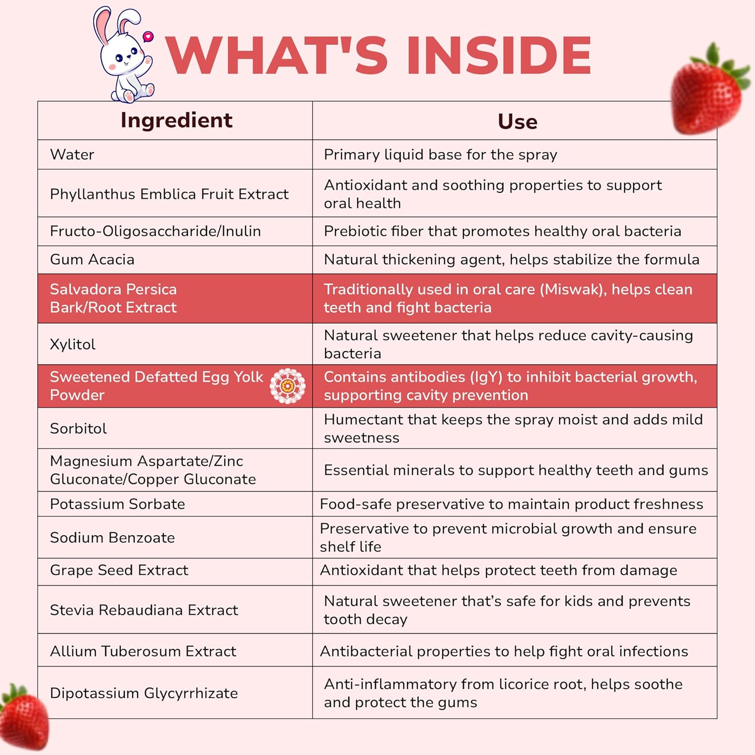 A opção de bico rotativo de 360 graus assegura uma aplicação uniforme, tornando a experiência ainda mais fácil e conveniente. Seu design compacto e a tampa protetora fazem dele um item essencial para viagens ou na correria do dia a dia. Além disso, seu sabor natural de morango torna o cuidado dental uma atividade prazerosa, estimulando os pequenos a manterem uma rotina de higiene bucal saudável. Fortalecido com minerais essenciais como zinco, magnésio e cobre, o spray anti-cáries vai além da limpeza, garantindo proteção e saúde bucal de forma eficaz.
