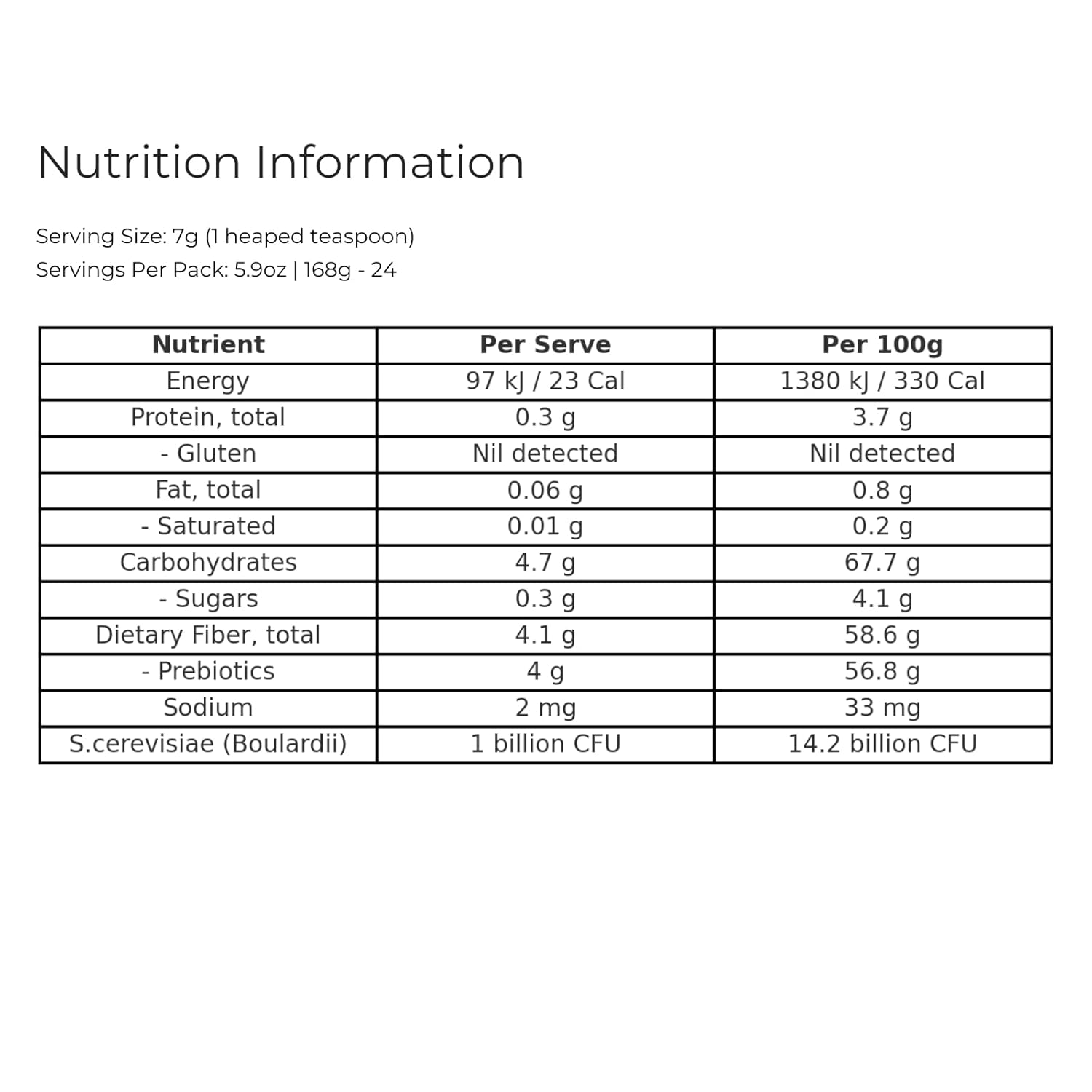 • Contém 1 bilhão de CFUs de Saccharomyces cerevisiae (Boulardii) por porção